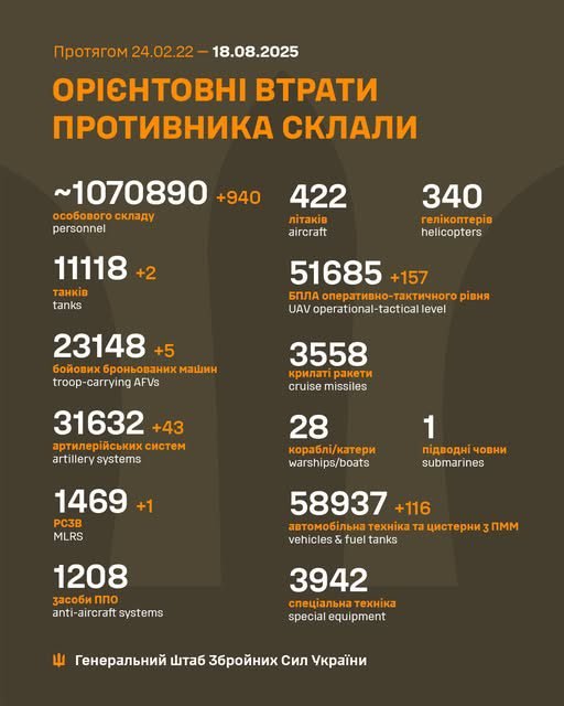 Згідно з повідомленням, загальні бойові втрати противника з 24 лютого 2022 року по 18 серпня 2025 року орієнтовно склали: