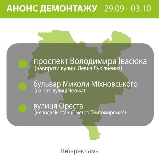 Повідомляється, що демонтажні бригади працюватимуть у трьох районах столиці: на проспекті Володимира Івасюка в Оболонському районі (навпроти вулиці Левка Лук’яненка), на бульварі Миколи Міхновського у Печерському районі (на розі з вулицею Чеською) та на вулиці Ореста у Святошинському районі (неподалік станції метро «Житомирська»).