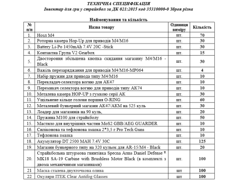 Як з’ясувала “КиївВлада”, загалом планують придбати 874 одиниці спорядження, зокрема 100 страйкбольних штурмових гвинтівок Specna Arms Daniel Defense R MK18 SA-19 Carbine with Brushless Motor Вlaсk, 100 масок сталевих та 100 окулярів ITEK Clear Antifog Glasses: