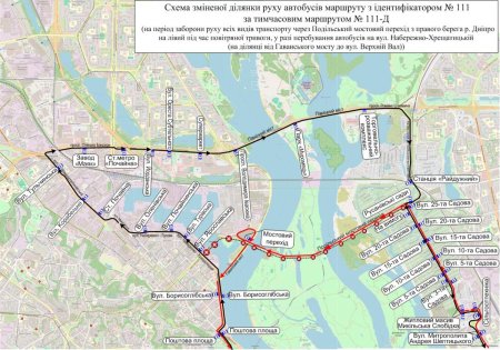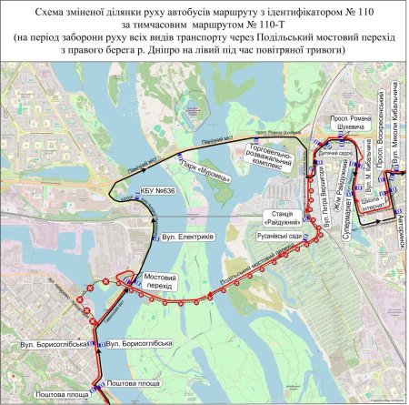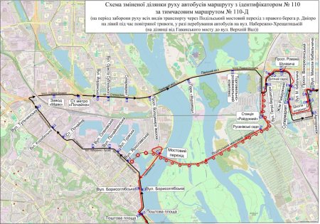 Якщо на момент оголошення повітряної тривоги автобуси № 110 та № 111 перебуватимуть на вул. Набережно-Хрещатицькій (на ділянці від Гаванського мосту до вул. Верхній Вал), вони продовжать рух за іншою схемою під номерами № 110-Д та № 111-Д відповідно: