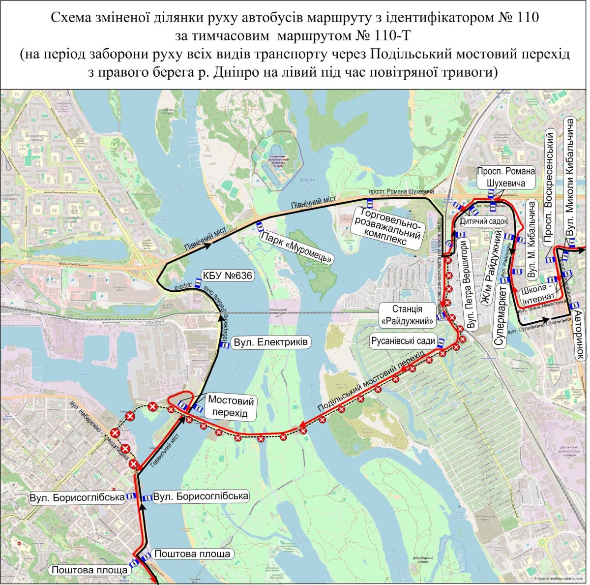№ 110-Т – пл. Українських Героїв – вул. Гетьмана Павла Скоропадського – вул. Володимирська – бульв. Тараса Шевченка – вул. Хрещатик – Володимирський узвіз – Боричів узвіз – вул. Набережно-Хрещатицька – Гаванський міст – вул. Набережно-Рибальська – Північний міст – просп. Романа Шухевича – під’їзна дорога до Подільського мостового переходу – вул. Петра Вершигори – вул. Райдужна – вул. Сулеймана Стальського – просп. Воскресенський – вул. Миколи Кибальчича – просп. Романа Шухевича – вул. Рональда Рейгана – вул. Миколи Закревського – вул. Сержа Лифаря – вул. Градинська – вул. Радунська – вул. Лісківська – вул. Милославська – пл. Героїв