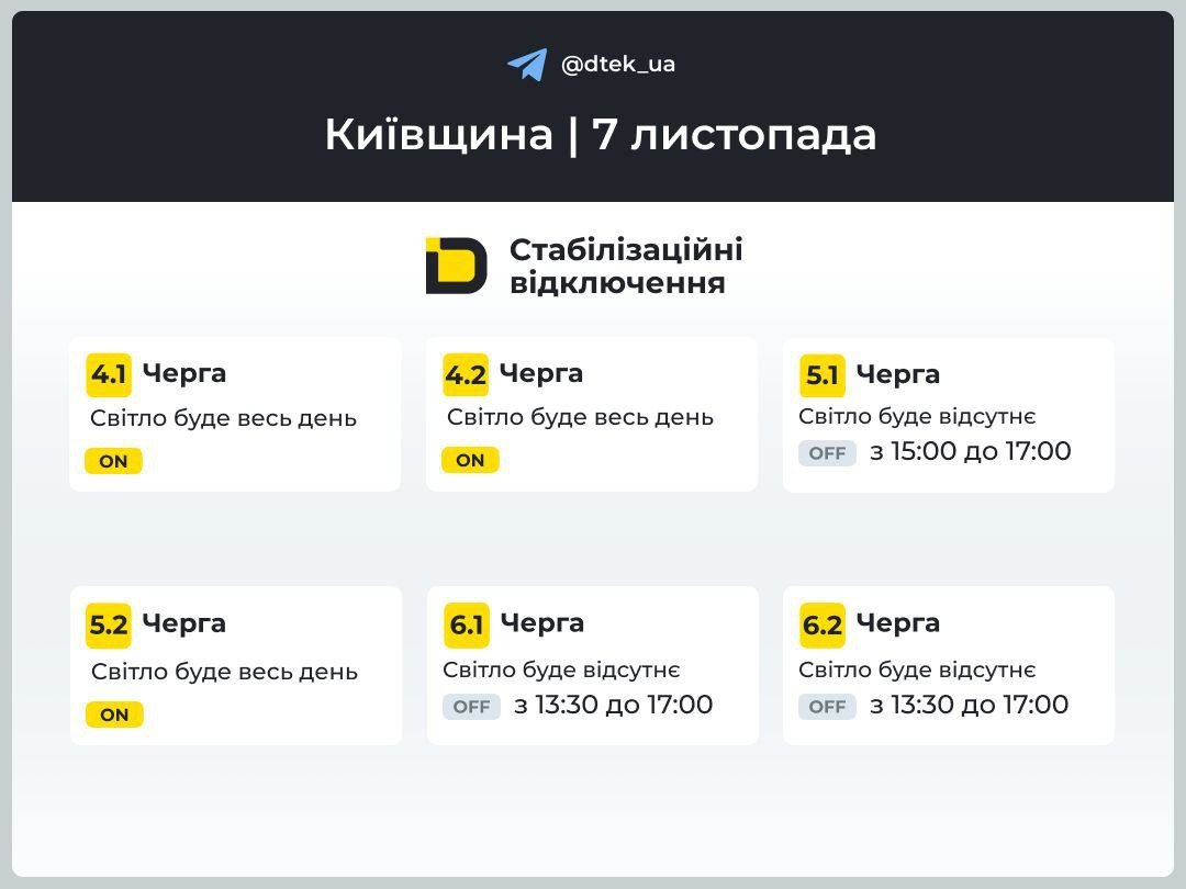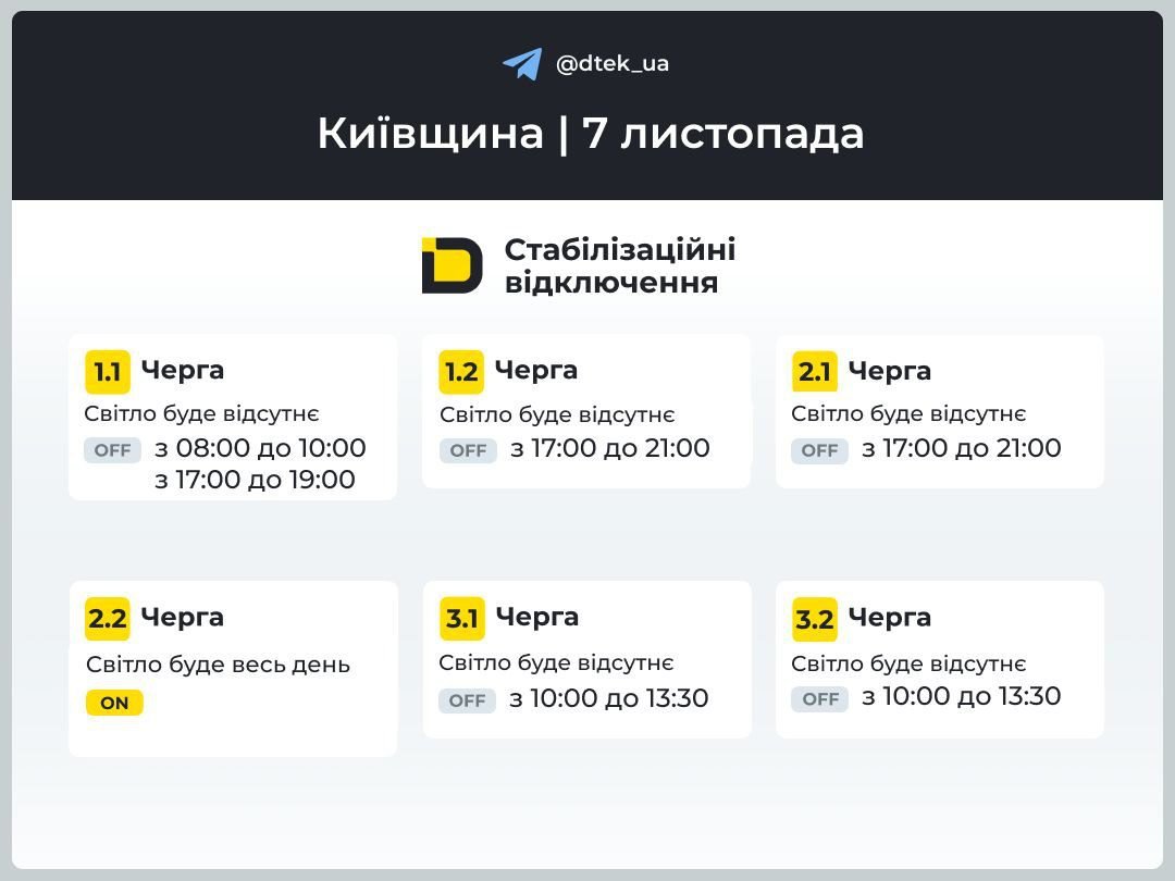 Крім того, енергетики оприлюднили оновлені графіки відключень на 7 листопада зокрема для Києва та області.