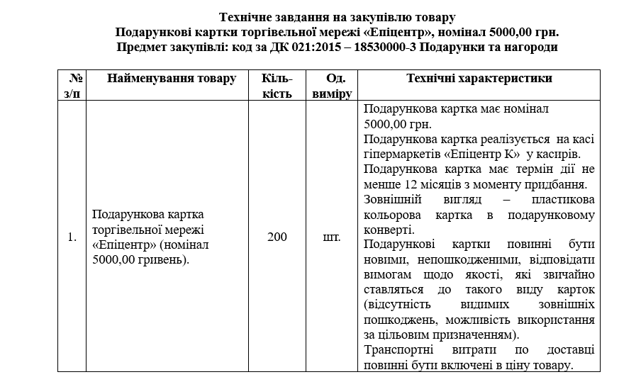 У Бучі мають намір придбати 200 подарункових карток мережі “Епіцентр”. На закупівлю виділено 1 млн гривень, поставка має пройти до початку зими цього року.