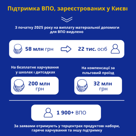 Наразі у столиці зареєстровані 433 тис. 214 осіб зі статусом внутрішньо переміщеної особи (ВПО). Серед них – понад 70 тис. дітей і більше 75 тис. пенсіонерів. Від моменту реєстрації у столиці переселенці стають частиною громади Києва та мають право на всі види підтримки, яку місто надає своїм мешканцям.