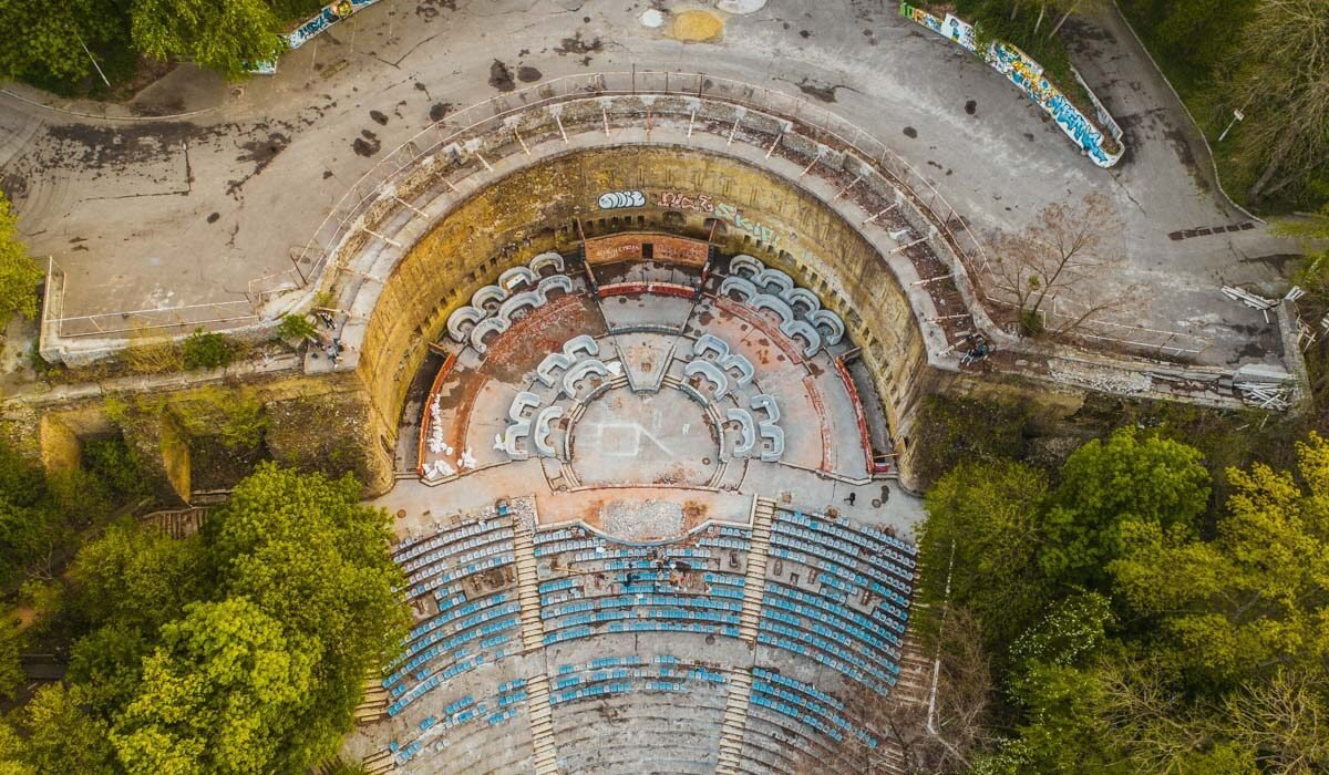 Сам амфітеатр з’явився вже у радянський період – його будували як великий відкритий культурний майданчик для вистав і концертів. Але з часом він занепав, багато конструкцій обвалилося або заросло чорнокленом, травою й мохом. Попри це, місце не втратило своєї чарівності: бетонні сходи, довгі проходи й напівзруйновані стіни створюють особливий настрій, трохи містичний, трохи по-академічному меланхолійний.