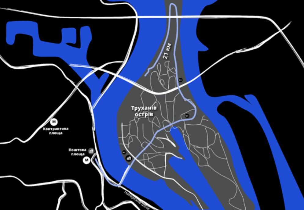 Труханів — це місце переважно для професійних бігунів і бігових клубів. Сюди можна дістатися від станції метро Поштова площа, пробігши вздовж набережної до пішохідного мосту.