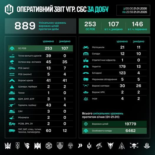 Загалом упродовж січня (01–21.01) знищено/уражено 19779 цілей, з них – 6462 особовий склад противника.