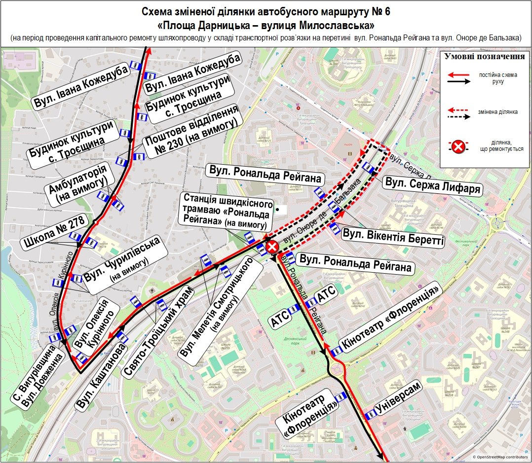 Із 14 лютого до орієнтовно 30 листопада через капітальний ремонт шляхопроводу на перетині вулиць Рональда Рейгана та Оноре де Бальзака змінить роботу наземний пасажирський транспорт.