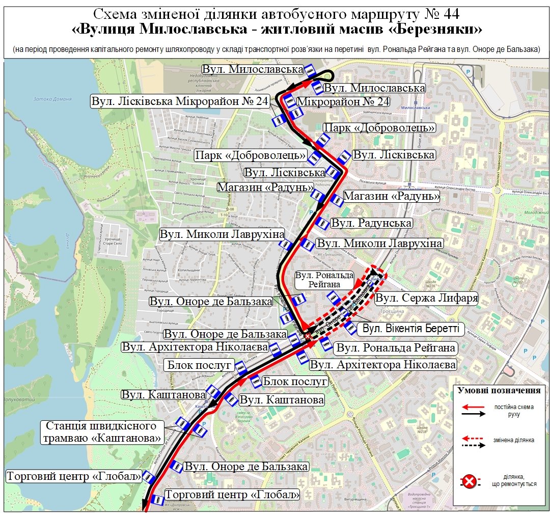 автобусний маршрут № 44 «Житловий масив «Березняки» – вул. Милославська» – від станції міської електрички «Березняки» до вул. Оноре де Бальзака (парна сторона) за власним маршрутом, далі шляхопроводом через колії швидкісного трамвая на вул. Сержа Лифаря – вул. Оноре де Бальзака (непарна сторона) – вул. Рональда Рейгана, далі за власним маршрутом до вул. Милославської. У зворотному напрямку – від вул. Милославської до вул. Рональда Рейгана за власним маршрутом, далі вул. Оноре де Бальзака (непарна сторона) – шляхопроводом через колії швидкісного трамвая на вул. Сержа Лифаря – вул. Оноре де Бальзака (парна сторона), далі за власним маршрутом до станції міської електрички «Березняки».