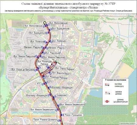 тимчасовий автобусний маршрут № 37ТР «Вул. Милославська – ст. м. «Лісова» – вул. Радунська (від вул. Милославської) – вул. Рональда Рейгана – вул. Оноре де Бальзака (непарна сторона) – шляхопровід через колії швидкісного трамвая на вул. Сержа Лифаря – вул. Оноре де Бальзака (парна сторона) – вул. Рональда Рейгана, далі за власним маршрутом до ст. м. «Лісова». У зворотному напрямку від ст. м. «Лісова» до вул. Рональда Рейгана за власним маршрутом, далі вул. Оноре де Бальзака (парна сторона) – шляхопровід через колії швидкісного трамвая на вул. Сержа Лифаря – вул. Оноре де Бальзака (непарна сторона) – вул. Рональда Рейгана, далі за власним маршрутом до вул. Милославської;