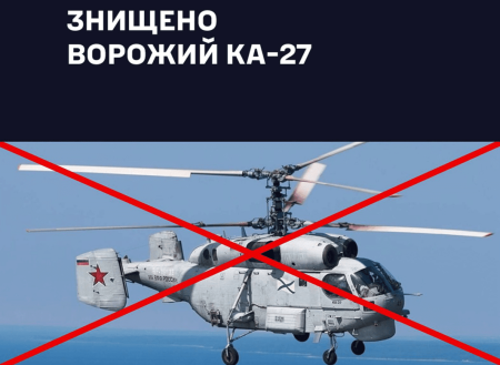 «Силами та засобами Військово-Морських Сил Збройних Сил України над акваторією Чорного моря знищено ворожий корабельний протичовновий вертоліт Ка-27», — йдеться у повідомленні.