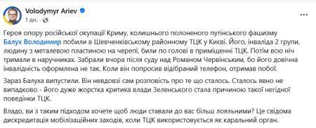 У Київському міському ТЦК та СП прокоментували повідомлення нардепа Володимира Ар’єва про побиття у Шевченківському центрі комплектування колишнього кримського політв’язня. В органі військового управління зазначили що чоловіка доставили до центру, так як він не мав офромленої у встановленому законом порядку відстрочки. Згодом його відпустили, надавши час для впорядкування військово-облікових даних. Слідами інформації народного депутата буде проведено службове розслідування.