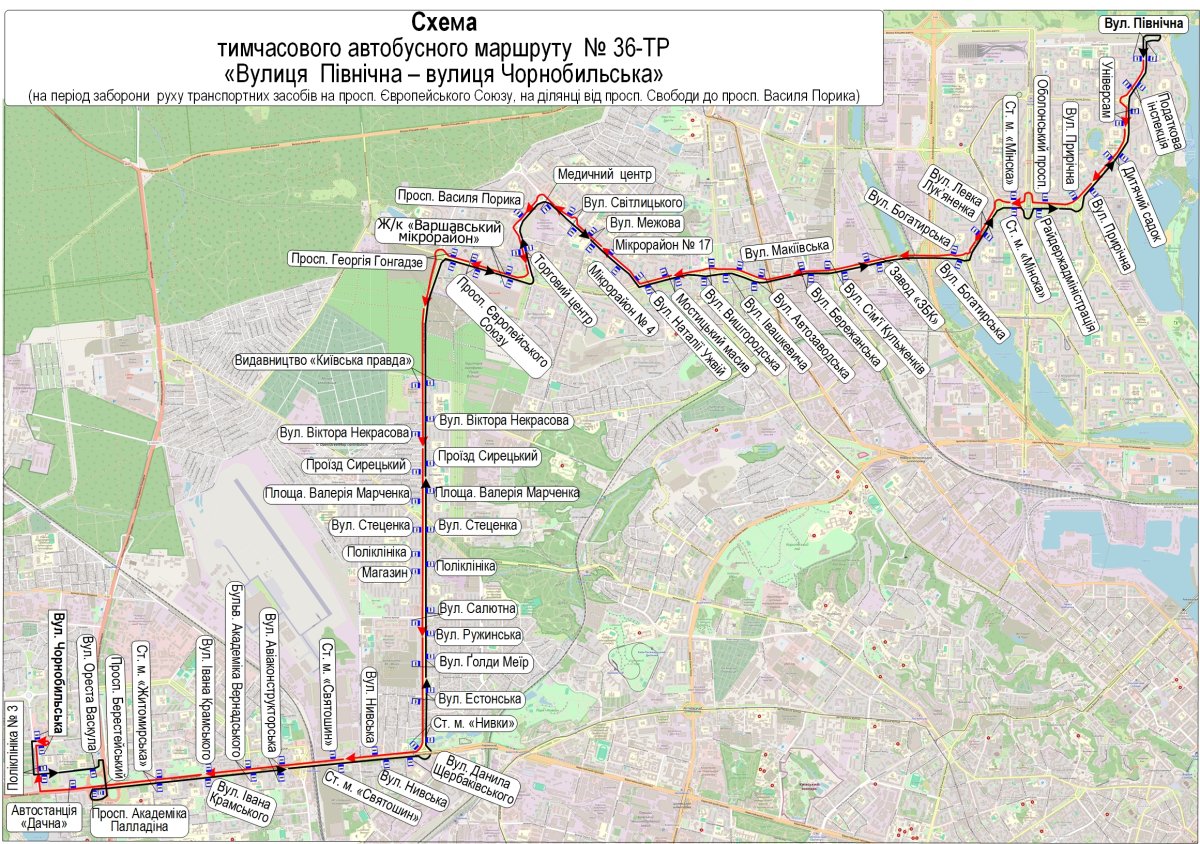 Крім того, з 6 квітня до орієнтовно 1 грудня продовжать дію тимчасових автобусних маршрутів №№ 36-ТР, 102-А через продовження тимчасового закриття руху на просп. Європейського Союзу – на ділянці від просп. Василя Порика до просп. Свободи. У ці дні транспорт курсуватиме: