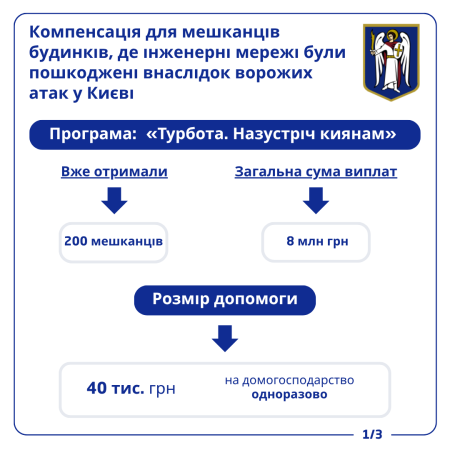 Нагадаємо, у лютому цього року столична влада прийняла рішення про виплату одноразової матеріальної допомоги у 40 тис. гривень на домогосподарство для мешканців, чиє житло постраждало через аварії на інженерних мережах внаслідок російських обстрілів.
