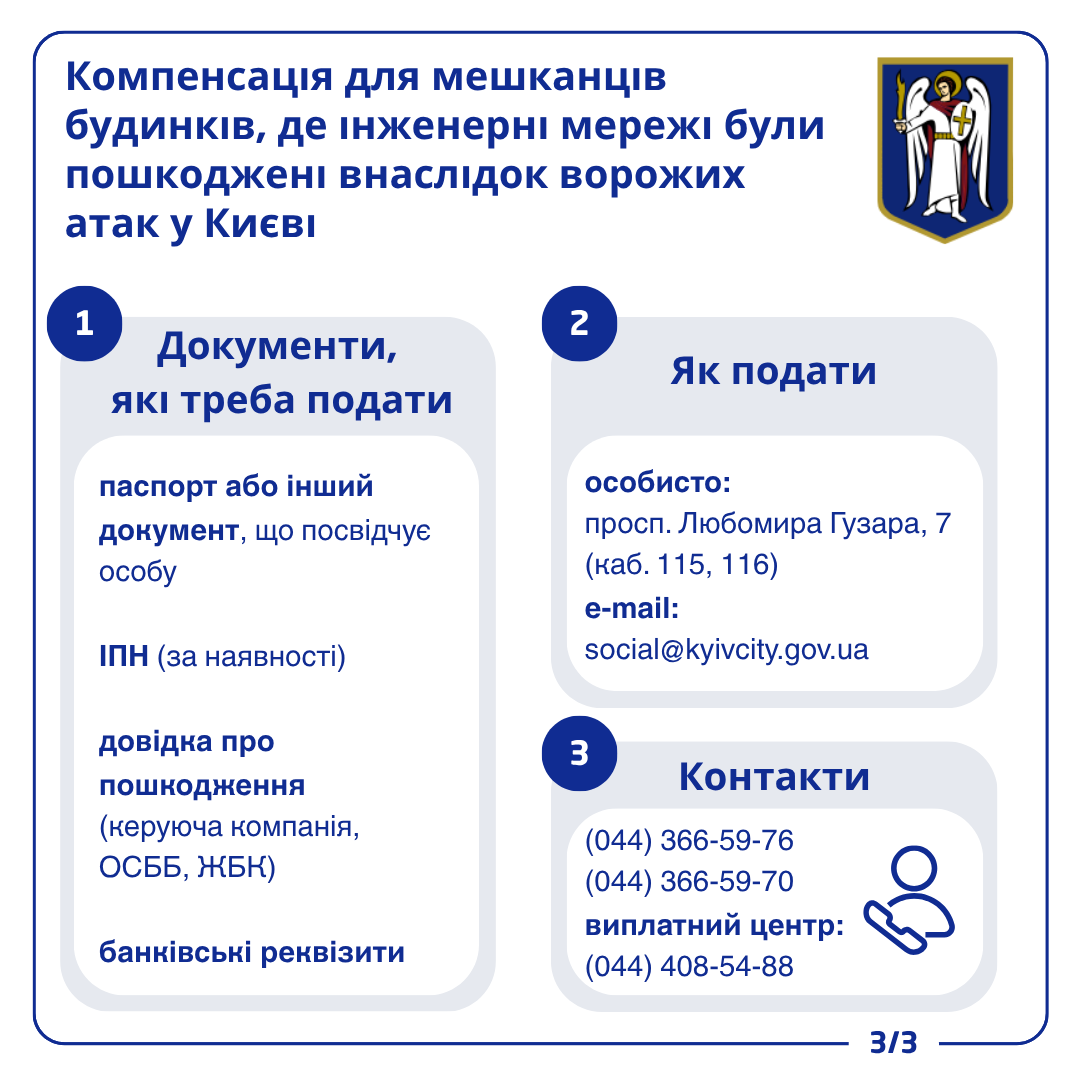 У Києві власники квартир, де інженерні мережі були пошкоджені внаслідок атак рф, можуть отримати 40 тис. гривень компенсації. Підтримка надається в межах міської цільової програми “Турбота. Назустріч киянам” та передбачена для випадків, які сталися після 1 січня цього року.