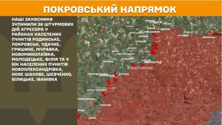 На Покровському напрямку наші захисники зупинили 36 штурмових дій агресора у районах населених пунктів Родинське, Покровськ, Удачне, Гришине, Муравка, Новомиколаївка, Молодецьке, Філія та у бік населених пунктів Новоолександрівка, Нове Шахове, Шевченко, Білицьке, Іванівка.