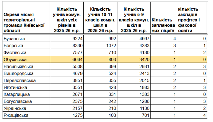 За відкритими даними Міносвіти щодо розподілу освітньої субвенції для громад Київської області на 2025 рік, за кількістю учнів у комунальних школах Обухівська громада посідає 9 місце серед 24 міських громад області. Однак за кількістю закладів освіти для учнів 10-11 класів вона входить до числа 7 з 24 міських громад, де на всю громаду передбачено лише один ліцей і немає жодного закладу професійно-технічної чи фахової передвищої освіти.