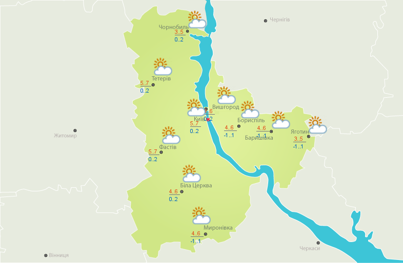 Вышгород: температура ночью 2…3, днем 4…5..В Вышгороде солнце в этот день будет редко показываться из-за облаков. Без осадков.