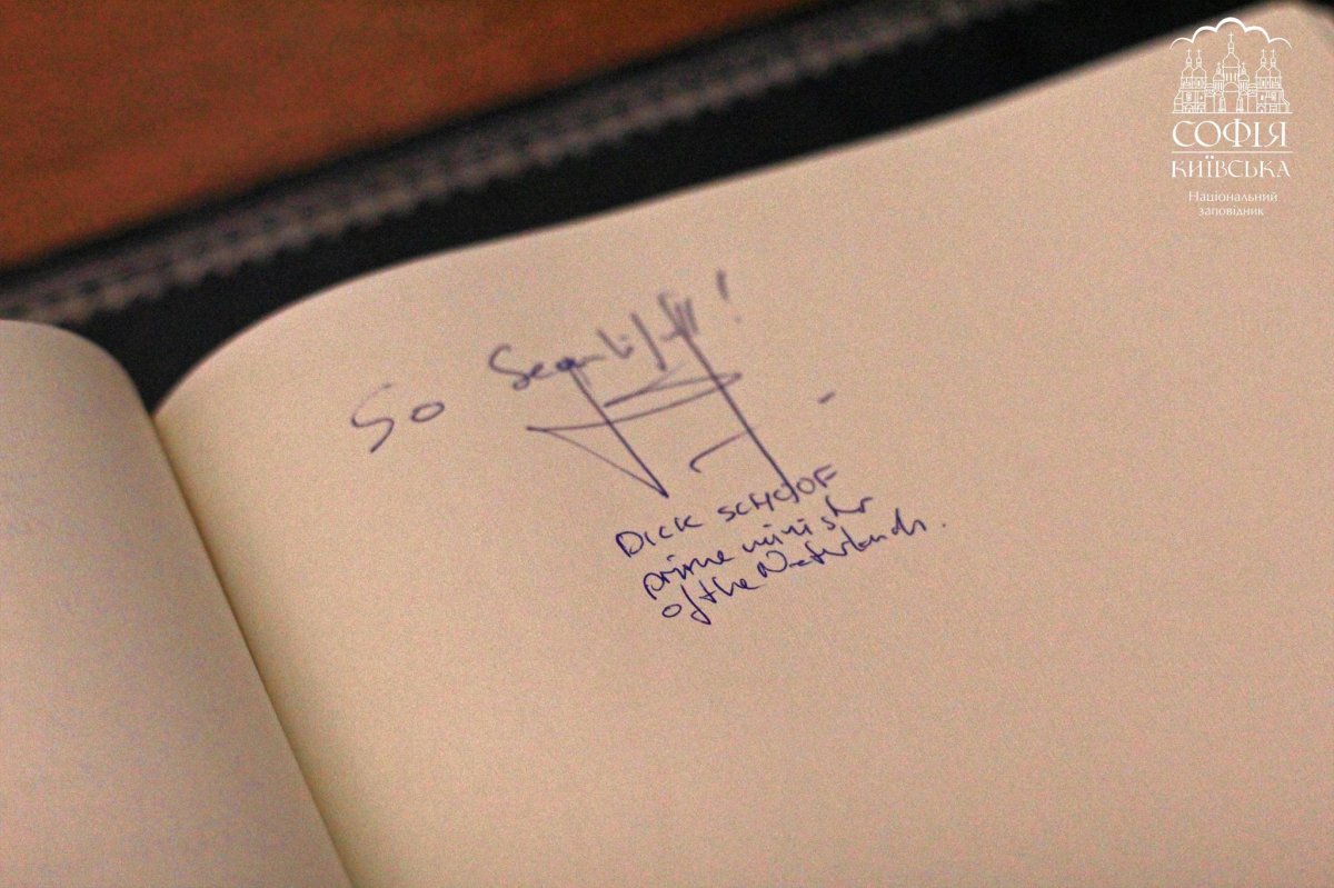 “Прем’єр-міністр (Нідерландів – КВ) оглянув унікальні мозаїки та фрески, ознайомився з реліквіями та фактами про витоки формування української державності, культури й ідентичності. На завершення візиту перший заступник генерального директора Національного заповідника «Софія Київська» Вадим Кириленко подарував Діку Схофу факсимільне видання Конституції Пилипа Орлика — важливого історичного свідчення демократичних традицій України, а також книгу «Василій ІІ і Софія Київська» англійською мовою. У цьому виданні вперше широко показано, що ця невідома раніше обставина має свій відбиток у графіті, мозаїках і фресках Святої Софії”, – сказано в повідомленні.